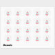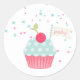 Un lindo pegatina para sobres o bolsos de favoritas de partido tiene un quequito rosa y azul con una cereza encima y un confeti de corazón y punto.