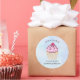 Pegatinas de negocios de pastelería y pastelería con un ilustracion de un delicioso quequito. Escarcha rosa y lloviznas de chocolate. Un portapapeles amarillo y una frambuesa encima. ¡Yummy!