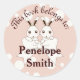 El diseño del producto incluye mellizos conejos con una cinta blanca y puntos de polka. Este adorable personalizado animal hace pegatinas lindos y únicos con textos personalizados para niños.