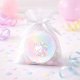 This sticker has an enchanted unicorn with a flowing multicolor mane on a soft watercolor rainbow wash with sparkle accents. This whimsical fantasy design creates a magical look for a girl’s birthday celebration.