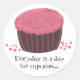 Un delicioso quequito con helado rosa y rociado. Un dicho divertido: 'Todos los días son un día para los quequitos'.