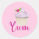 Pegatinas con un delicioso quequito rosado con ribetes escrupulosos de helado rosa con un portapapeles amarillo. Una frambuesa con tallo y hojas en la parte superior. Soñador y delicioso. El texto dice Yum con un elegante y moderno tipo de letra. Situado en un entorno rosa pastel.