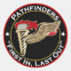 Foto original de una insignia de Pathfinder con el lema "First In, Last Out"