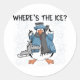 Un pingüino vestido con un abrigo azul, gorra y bufanda lleva sus patines de hielo y pregunta "¿Dónde está el hielo?". Este lindo diseño de patinaje sobre hielo de pingüino en camisetas, tarjetas, tazas, bolsos de té y otros artículos es perfecto para patinadores gráficos!