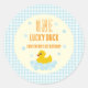 ¡Un pato afortunado! Primer cumpleaños con un pato de caucho y burbujas contra un gingham azul claro y fondo amarillo pálido con texto naranja