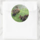 Fotografía de dominio público de un lindo pato de mamá y sus pollitas, en el césped cerca del lago.