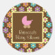 Este pegatina redondo con una ducha para bebés presenta tonos pastel y un fondo marrón chocolate. En el centro del pegatina hay un cuadrado marrón con texto de personalizable y un carruaje de bebé rosa.