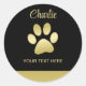 Pegatina Redonda Paw dorada de perro brillante sobre fondo negro