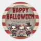 Estas espeluznantes etiquetas de pegatinas personalizados de Halloween presentan un temática espeluznante del carnaval. Tres payasos aterradores están impresos en la parte inferior. En el fondo se presenta un poster de carnaval de papel de pergamino de estilo vintage, sobre un patrón de rayas rojas y blancas. El saludo "Halloween feliz" se imprime en la parte superior con una fuente siniestra y roja. Un nombre de familia de ejemplo se imprime encima de los payasos, que puede personalizar para incluir su propio nombre o texto personalizado.