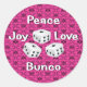 Aquí hay un diseño gráfico inspirador para que puedas compartirlo con otros jugadores de bunco. Este mensaje positivo dice: Paz, Alegría, Amor y Bunco. Compra uno como regalo o premio. Personaliza con tu propio nombre, nombre de grupo o fecha.