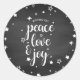 Disfruta de esta pegatina de fiesta con las palabras paz amor y alegría superpuestas en pizarra con las estrellas decorativas.