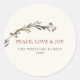 This elegant "Peace, Love & Joy" holiday round sticker feature modern and minimal watercolor greenery with red berries on a neutral background. The text is easily personalized with your choice of greeting, family name, year.