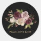 This elegant "Peace, Love & Joy" black holiday round sticker features modern, minimal watercolor winter bouquet on a black background.