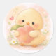 A soft and cozy chick holding a sweet peach.