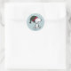 This circular, classic Peanuts sticker features a simple, sweet illustration of Snoopy, the beloved beagle. Snoopy is sitting up with a contented, smiling expression. He is wearing a long, festive Christmas sleeping cap or beanie that is striped in red and green with a matching red cuff. The hat has a tassel hanging down, giving it a playful, holiday feel. The illustration is set against a soft, pale blue background. This officially licensed sticker is ideal for holiday mail, Christmas gifts, or adding a touch of seasonal cheer to your belongings, perfect for fans of the Peanuts gang and classic holiday themes.