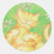 Un gatito de tabby amarillo feliz revoloteando sobre el césped bajo el sol. Pegatina con un diseño de personalizable amarillo, naranja, verde, blanco y azul para que usted pueda personalizar con su propio texto, imágenes e ideas. Dibujo original de Jess Perry a lápiz de color.