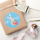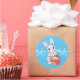 Este pegatina redondo se muestra en un conejo festivo de Pascua con huevos impresos en un bonito color azul cielo. Personalizar este artículo o compra tal cual.