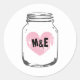 Rústica moda de campo mason jar pegatinas de bodas para favores. También son buenos selladores de sobres. Diseño vintage para el fiesta casero de verano DIY, ducha de novia, compromiso o aniversario. diseño de bonito con un símbolo de amor anticuado monogramado con las iniciales de nombre de novia y novio/esposo y esposa. Color del fondo del personalizable. Personalizable con nombre o monograma. El corazón aguado rosado.