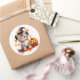 Pegatina redondo se muestra con una huella de arte de gatito de Halloween. Personalizar este artículo o compra tal cual.