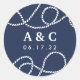 Los pegatinas de la moda costera para sus invitaciones a la boda o sus favores presentan sus iniciales y fecha boda con letras blancas en un fondo azul marino clásico, flanqueado por ilustraciones de cuerda náutica en bucle.