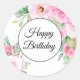 El pegatina redondo feliz de cumpleaños se muestra con una impresión floral rosa bonito. Personalizar o compra como está.