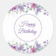 El pequeño pegatina redondo de feliz cumpleaños se muestra con una hermosa impresión floral morada. Personalizar o compra como está. Imprimir material freepik.com