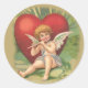 Un ilustracion El día de San Valentín muy bonito hace un pegatina o un sello para sobres delicioso. Cupid está sentado en el suelo descansando sobre un enorme corazón rojo y tocando una flauta. Muy lindo.