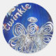 Los ángeles blancos y plateados descansan sobre un cielo nocturno azul índigo. A la izquierda aparece una estrella bajo la brillante palabra "twinkle". Purpurina en la pintura le da a este ángel la pintura de la magia de un brillo. Esta es una gran imagen de ángel para usar durante las vacaciones como Navidades o Año Nuevo. ¡personalizar a este pegatina inspirador con tus propias palabras para hacer llamadas especiales de ángel guardián para los eventos!