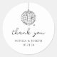 Estos pegatinas modernos y elegantes, bodas en blanco y negro o duchas de novias presentan un estilo moderno y minimalista, con un guión escrito a mano que dice "gracias" así como texto clásico. En un ilustracion sutil se encuentra una bola de discoteca, de dibujos a mano, retro.