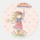 Pegatina Redonda Pequeño Chica capricho y gatito en la lluvia