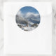 Pegatina Redonda Pequeño pueblo con montañas Dolomitas en la nieve