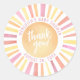 Este diseño pegatina redondo presenta un sol vibrante en el centro, con la alegre frase "¡Gracias!" colocada en la parte superior. Los rayos del sol brillan en cálidos tonos amarillos, naranjas, rosas y rojos, añadiendo un toque alegre y luminoso a la ducha de bebé. Al rodear el sol, "Mom's Name Baby Shower" y la fecha de la ducha de bebé están elegantemente situados alrededor del borde, creando un diseño impecable y personalizado. Este pegatina es una adición perfecta a los favores, regalos de agradecimiento o decoraciones, uniendo maravillosamente tu celebración temática. Personalizable completo, puede actualizar el nombre y la fecha para que coincidan con los detalles del evento. ¡Una manera dulce y atenta de apreciar a sus huéspedes!
