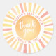 Este diseño pegatina redondo presenta un sol vibrante en el centro, con la alegre frase "¡Gracias!" colocada en la parte superior de una cálida fuente de color rojo naranja. Los rayos del sol brillan en tonos clásicos amarillos, naranjas y un toque de rojo, añadiendo un toque luminoso y alegre a la ducha de bebé. Al rodear el sol, "Mom's Name Baby Shower" y la fecha de la ducha de bebé están elegantemente situados alrededor del borde, creando un diseño impecable y personalizado. Este pegatina es una adición perfecta a los favores, regalos de agradecimiento o decoraciones, uniendo maravillosamente tu celebración temática. Personalizable completo, puede actualizar el nombre y la fecha para que coincidan con los detalles del evento. ¡Una manera dulce y atenta de apreciar a sus huéspedes!