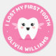 Pegatinas con un pequeño hada de dientes sobre un fondo rosado caliente y el texto "Perdí mi primer diente" y el nombre del personalizable debajo.