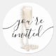 Sellos de cierre de sobre de despedida de soltera que presentan perlas colgadas de una copa de champán y "Estás Invitado" en letra chic. Artículos COINCIDENTES en nuestra colección.