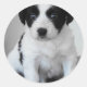 Fotografía de un cachorro blanco y negro sentado obedientemente para la cámara.