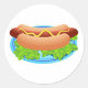 Ilustracion de un sabroso hotdog cubierto de mostaza y descansando sobre una cama de hojas de lechuga. Imagen disponible en varios regalos y productos. Pegatinas.