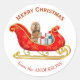 Un adorable perro Cocker Spaniel de color beige está sentado entre paquetes de regalo envueltos en colores brillantes en un trineo navideño rojo y dorado ornamentado. En la parte superior hay texto estilizado rojo que dice "Feliz Navidad". En la parte inferior está tu firma personalizada. Festivo para paquetes o como sello de sobre.