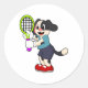 Pegatina Redonda Perro en tenis con raqueta de tenis