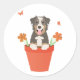 Pegatina Redonda Perro pastor australiano en maceta de flores