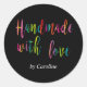Colorido texto escrito a mano "Mano hecha con amor" sobre un fondo negro. Personalízalo con tu propio nombre haciendo clic en el botón personalizar.