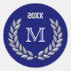 Leyenda de laurel gris claro plateado con monograma personalizado sobre Pegatina azul. Listo para ser personalizado.
