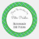 Un pegatina de enlatamiento o horneado personalizado con escritura a mano y letras de bloque sobre un patrón retro de manto verde con pequeñas rayas blancas y azules para pepinillos, mermeladas u otras recetas.