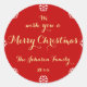 Elegante, personalizado, personalizado, navidad rojo, hermoso guión de oro falso / tipografía "Te deseamos una Feliz Navidad", copos de nieve, hoja clásica de pegatinas redondos. Para el personalizar, simplemente escriba su nombre / nombre de la pareja / apellido / apellido, y el año. Un hermoso pegatina perfecto para tus navidades de correo esta temporada de vacaciones.