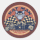Logo de la tienda de autos retro-vintage de imitación: "Hombre de la rata - Personalizados derrocados - ¡a nivel nacional!" Con la cabeza de rata de personalizado sonriente, la bandera a cuadros y una camiseta de rata, en un fondo redondo. Camisetas, caramelos, cartas, regalos.