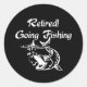 ¡Retirado! Pescando. Texto blanco sobre un fondo negro con un pez blanco a punto de morder el anzuelo en un gancho.