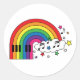 El arcoíris feliz y colorido se transforma en teclas de piano a medida que sale de una nube musicalmente esponjosa rodeada de notas musicales y estrellas coloridas.