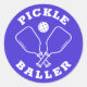 Un pegatina de moda con un logo de dos palas con el logo de un personalizado "PICKLE BALLER" y una bola delimitada por la frase de cabecera de la taza. Excelente adorno a cartas, regalos y más. ¡Una idea de regalo divertida para cumpleaños, Día de la Madre, Día del Padre, aniversario, cualquier día en realidad! Disponible en una selección de colores energéticos modernos.