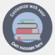 pila de libros personalizados de pegatinas redondos a personalizado con su propio texto.