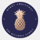 Pegatina Redonda Piña de oro Rosa sobre azul marino | Navidad